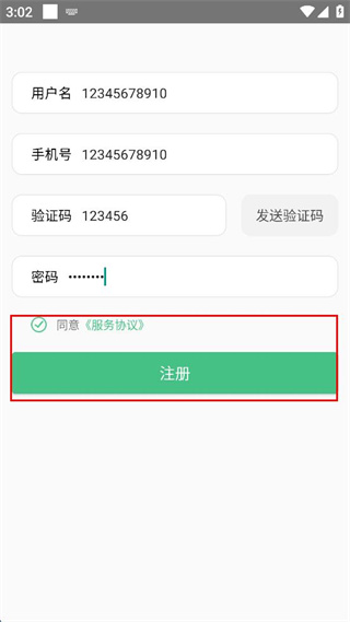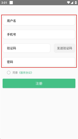 3、勾选同意服务协议的选项,确认用户名手机号验证码密码均已填写完整,最后点击页面中的注册按钮完成操作。