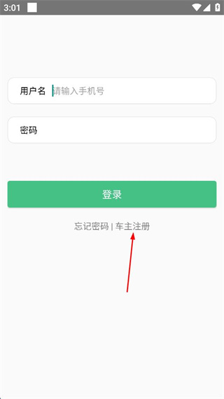 1、进入软件登录页面,找到用户名输入框输入手机号,找到密码输入框准备填写,再点击登录按钮下方的车主注册选项。