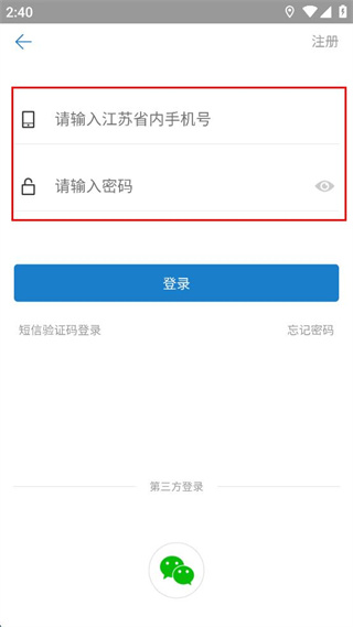 3、在登录界面填写江苏省内手机号与对应的登录密码信息。