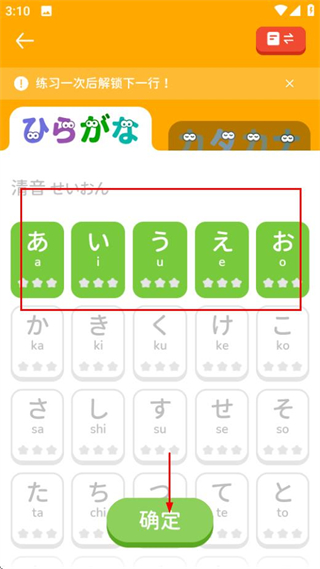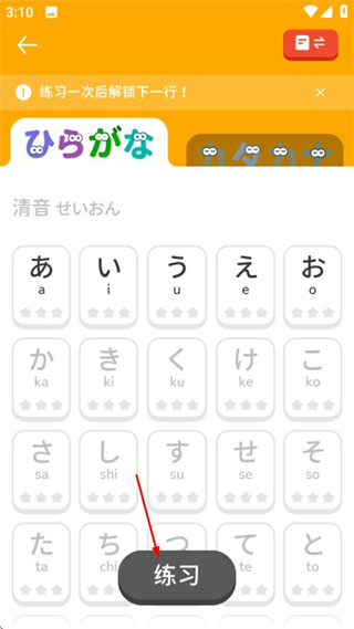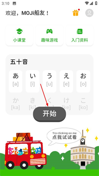 1、在MOJiKana首页点击开始按钮,进入五十音练习选择页面。