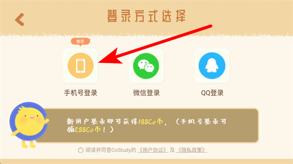 1、打开CoStudy,点击界面右上角的登录,进入登录方式选择页面。