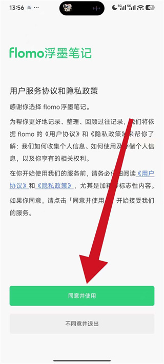 1、打开flomo浮墨笔记,在协议页面点击同意并使用,进入登录注册选择界面。