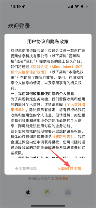 1、在用户协议和隐私政策弹窗中,点击同意,进入迈聆会议的欢迎登录页面。