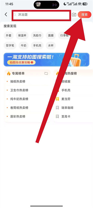 2、在搜索界面,输入目标商品关键词,点击搜索。