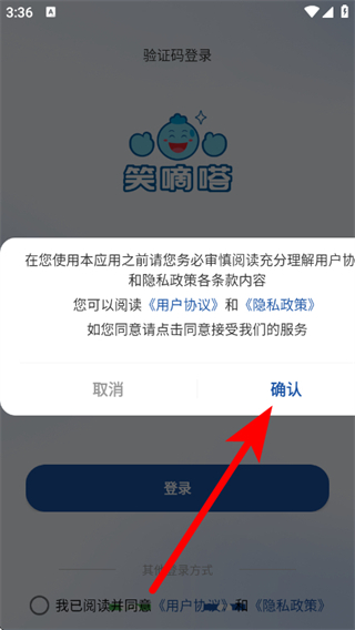 1、在笑嘀嗒洗车的用户协议弹窗中,点击确认,进入验证码登录页面。
