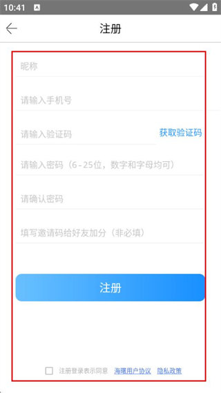 4、在注册页面填写信息并勾选协议后,点击注册完成账号注册。