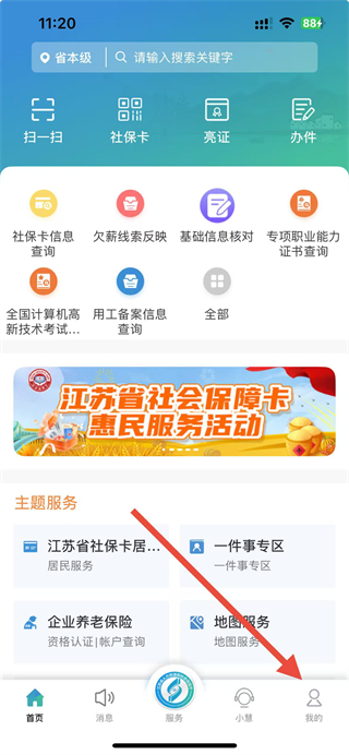1、打开江苏智慧人社APP后,在界面底部找到我的选项并点击,进入个人界面。