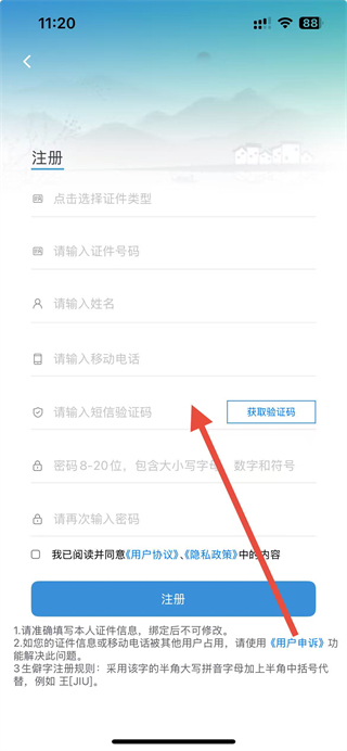 安装APP,准确填写证件类型、证件号码、姓名、移动电话、密码、确认密码、短信验证码。提交后完成注册。
