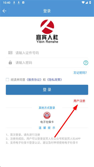1、打开宜宾人社APP后,在首页找到点击登录按钮并点击,进入登录相关界面。