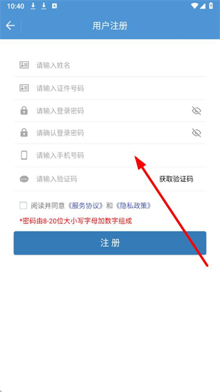 3、在注册页面依次填写信息,获取并填写验证码后勾选协议,点击注册完成操作。