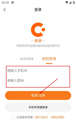 4、在密码登录页,填写请输入手机号和请输入密码,点击登录/注册。