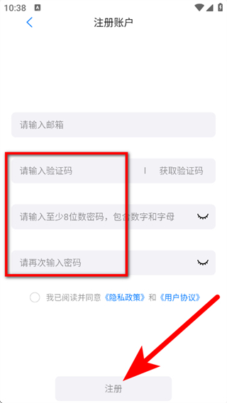 5、在输入框输入验证码,设置符密码,勾选相关协议后,点击注册,完成账户注册。