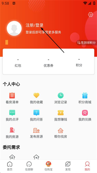 3、在我的页面,点击顶部的注册/登录区域,进入登录页面。