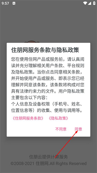 1、阅读服务条款与隐私政策,点击弹窗中的同意,以使用服务。
