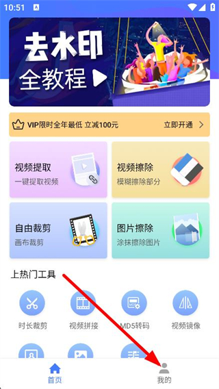 1、打开去水印大师app,点击底部导航栏的我的选项。