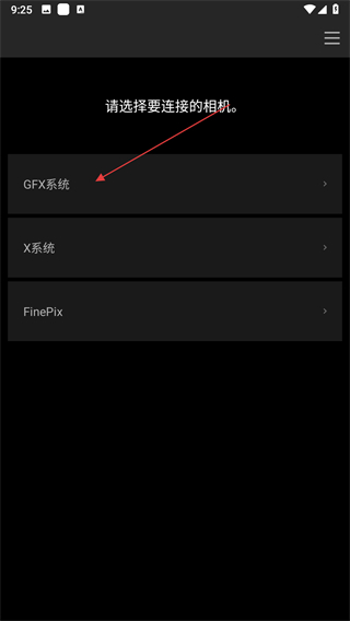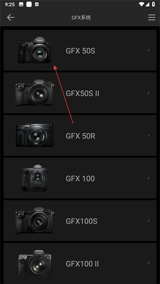 2、在GFX系统相机列表里,找到想要连接的相机型号并点击,进入该相机的设置准备界面。