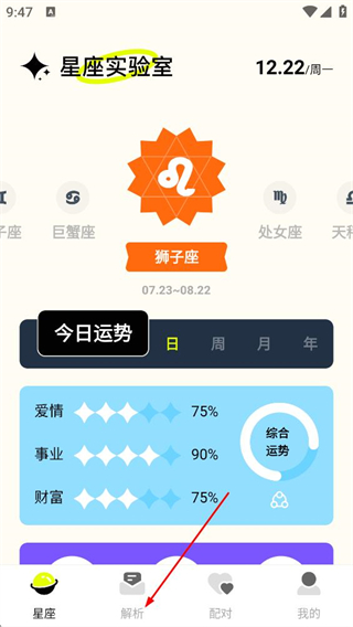 2、在星座页面,点击底部导航栏的解析选项,进入星座解析页面。