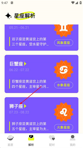 3、在星座解析页面,点击对应星座,查看该星座的详细解析内容。