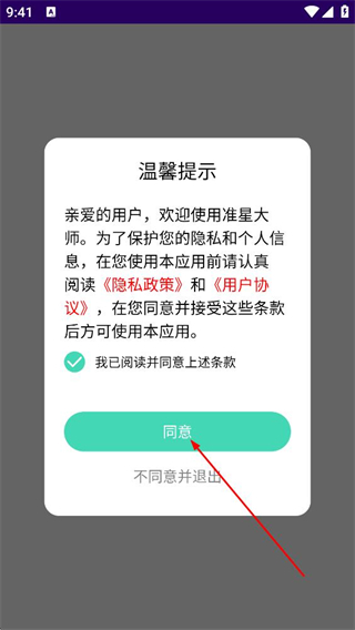 1、阅读温馨提示中的隐私政策和用户协议,勾选后,点击同意。