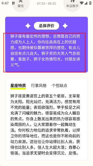 4、在星座详情页,我们即可查看总体评价及星座特质等板块的信息。