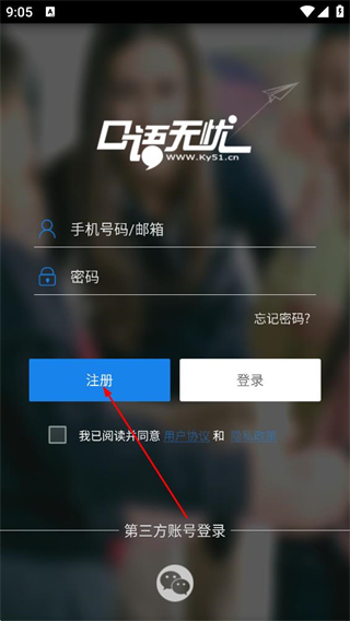 2、随后我们在登录注册页,点击注册按钮,进入注册页面。