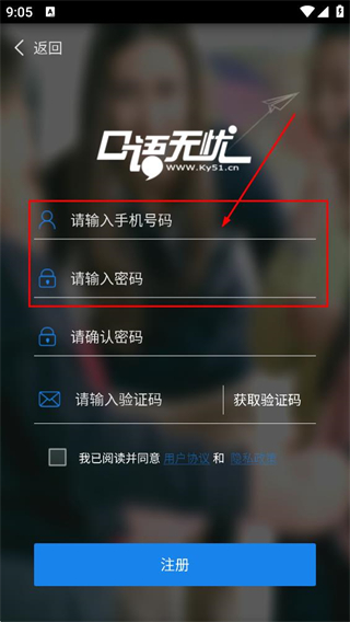 3、在注册页,填写请输入手机号码和请输入密码,进行下一步的操作。