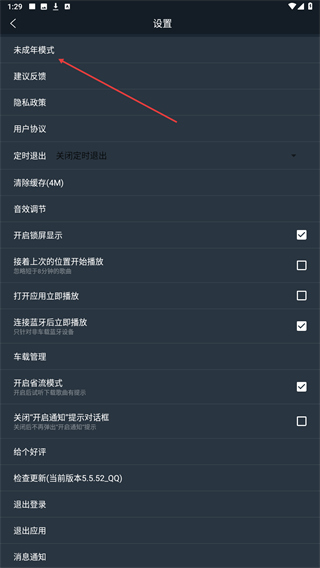3、在设置页面中找到未成年模式选项,点击进入模式配置界面。