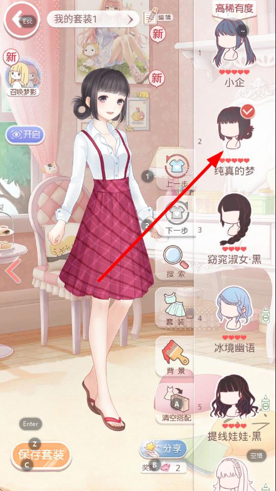 2、在自由换装界面,右侧有各类服饰分类栏,滑动找到想更换的套装部件,点击对应部件像选择纯真的梦发型进行更换,逐步搭配出目标套装样式。