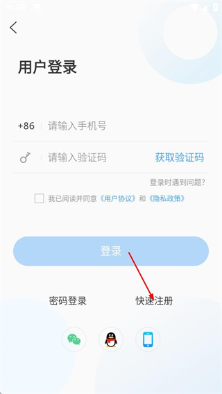 3、在登录页面点击快速注册选项,进入用户注册页面。