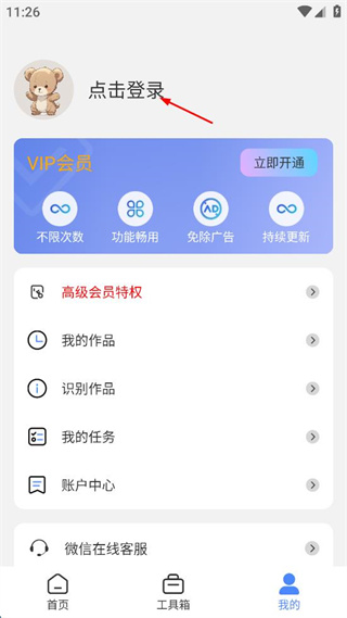 2、在个人界面,点击“点击登录”按钮,进入登录选择界面。