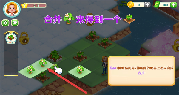 2、根据提示,拖拽2件相同的植物类物品到一起,完成合并操作,获取更高级的物品。