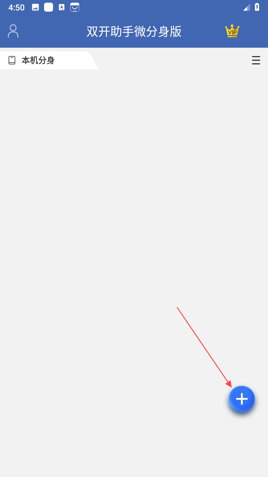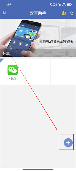 1、打开双开助手微分身版应用,进入主界面后,点击界面右下角蓝色带有+号的按钮,进入添加双开应用页面。