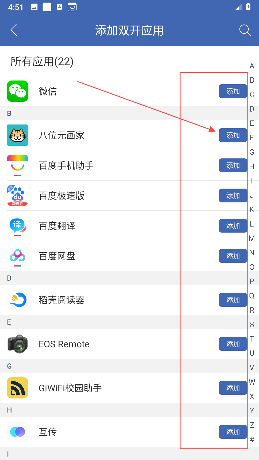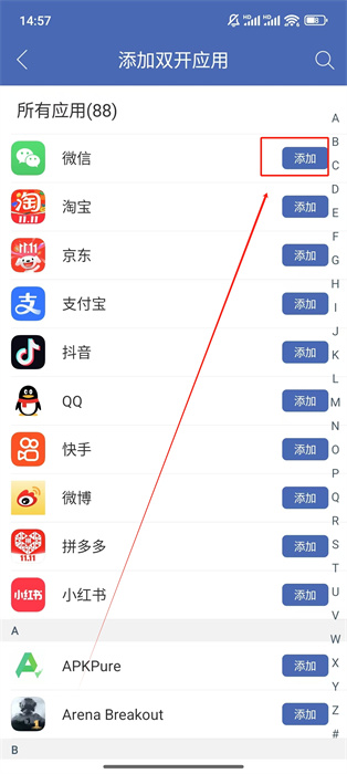 2、在添加双开应用页面,会显示手机中已安装的所有应用列表,找到想要双开的应用,点击应用右侧对应的添加按钮。