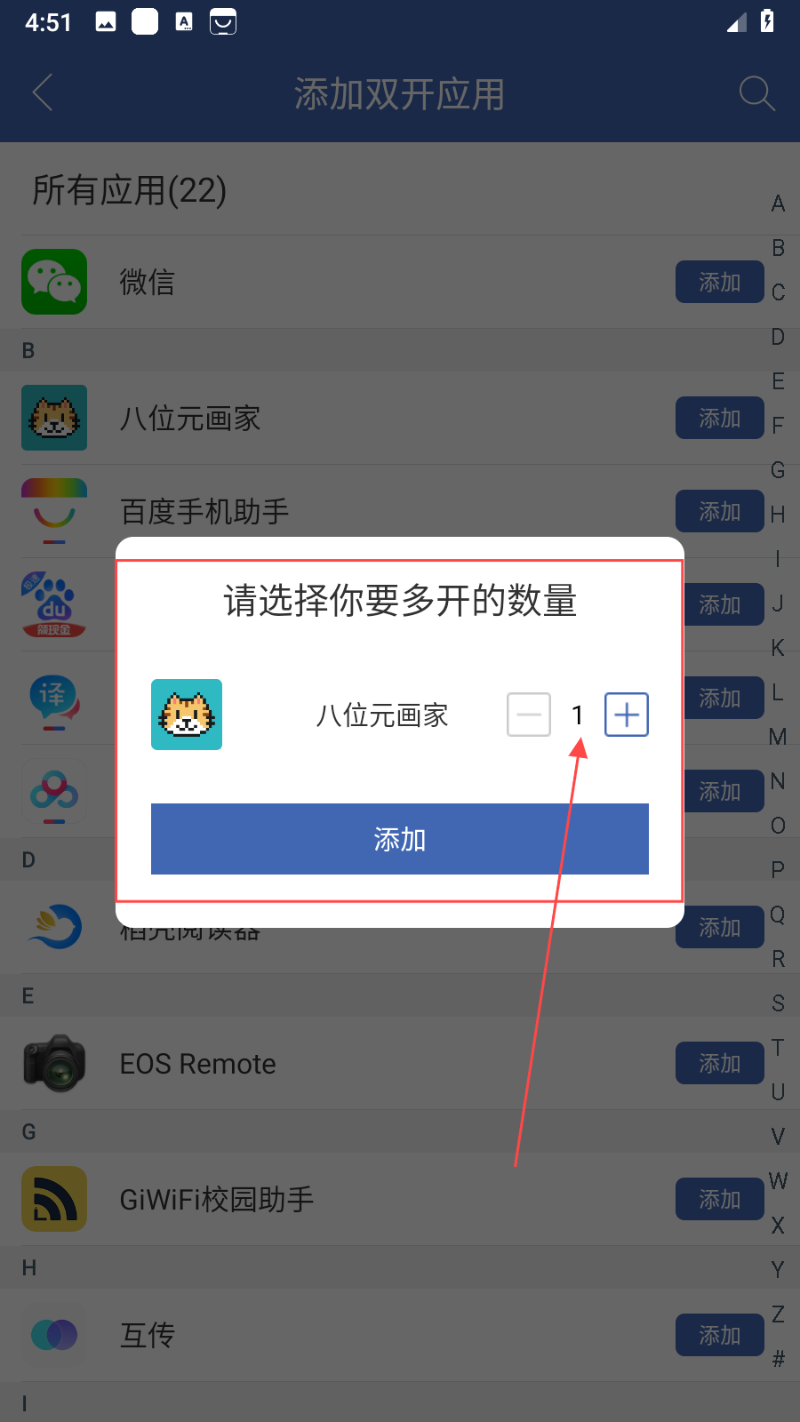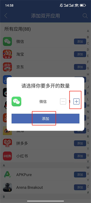 3、点击添加后,部分应用可能会弹出选择多开数量的窗口,根据自身需求,点击+或-号来设置要多开的数量,设置完成后再次点击添加,等待应用双开创建完成。