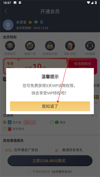 4、在温馨提示弹窗中点击我知道了按钮,即可完成3天VIP会员试用权限的领取。