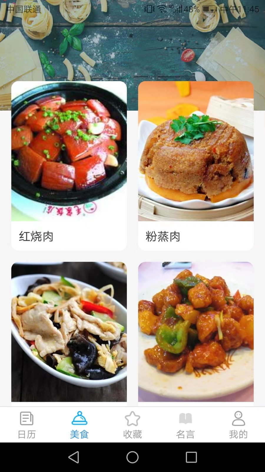 2、是一款以黄道吉日日历、美食菜谱和名言名句组成的综合软件;