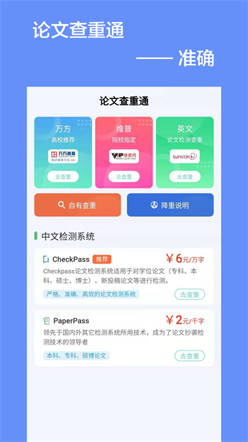 论文查重通app是一个专门服务于论文领域的应用软件,主要帮助大家进行论文查重、修改润色论文、查阅论文书写资料等,平台上还有丰富的写作模板提供给大家使用,用户一键即可查看论文的重复率,在线修改论文,超级的方便实用,有需要的朋友快来下载用起来吧~