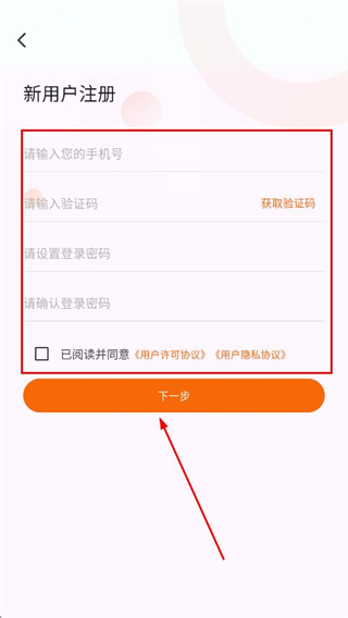 2、在新用户注册页面,输入手机号、验证码,设置登录密码并确认,勾选协议,点击下一步。