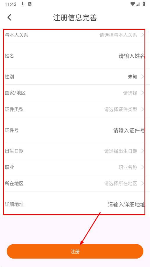 3、填写与本人关系、姓名、性别、证件类型及号码等信息,最后点击注册。