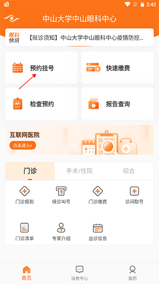 1、打开中山眼科中心,在首页点击预约挂号选项。