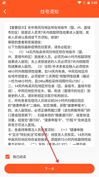 2、进入挂号须知页面,勾选我已阅读后点击下一步。