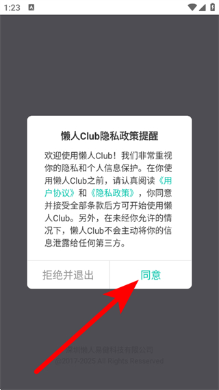 1、打开懒人club,在隐私政策提醒弹窗中,点击同意,进入主页面。