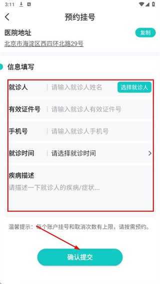 4、进入预约挂号页面,填写信息,描述疾病,点击确认提交,完成挂号操作。