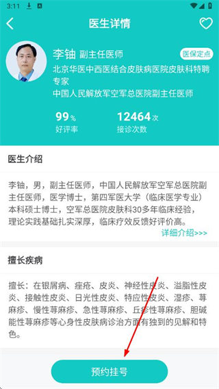 3、在医生详情页面,点击预约挂号按钮。