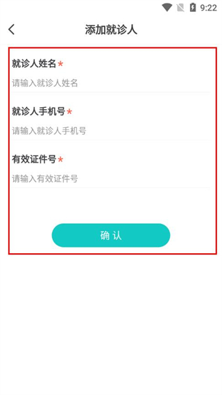 4、在添加就诊人页面,填写就诊人姓名、手机号、有效证件号后点击确认。