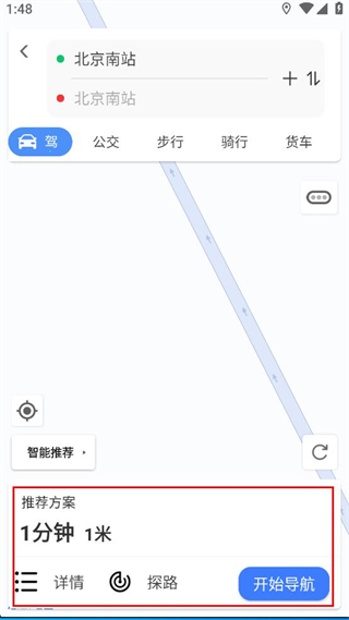 4、完成起点和终点的填写后,查看推荐的路线方案,点击开始导航按钮启动导航。