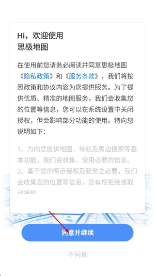 1、打开思极地图,阅读页面展示的隐私政策和服务条款,点击同意并继续按钮进入应用。