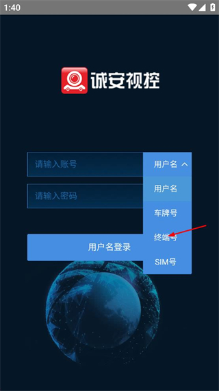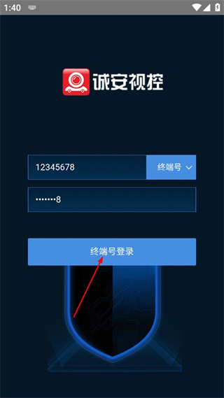 1、打开诚安视控应用,在账号输入框旁的选项中选择终端号,使登录方式切换为终端号登录。