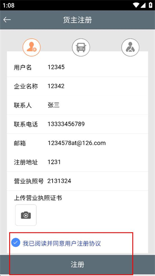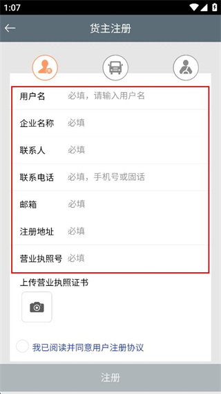 2、在货主注册界面,依次填写用户名企业名称联系人等必填信息内容。