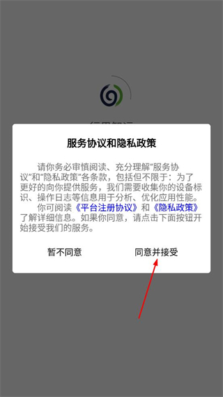 1、打开行果智运软件,弹出服务协议和隐私政策弹窗,阅读后点击同意并接受按钮。
